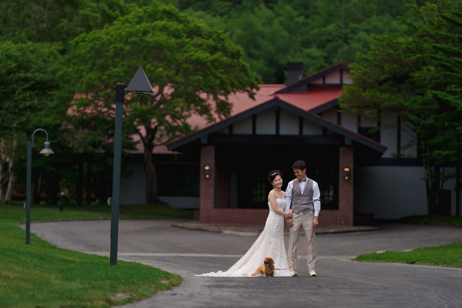 最初は新郎新婦お二人だけでの撮影がメインでしたが、後半は愛犬ちゃんも交えての、家族三人でも写真が中心に。